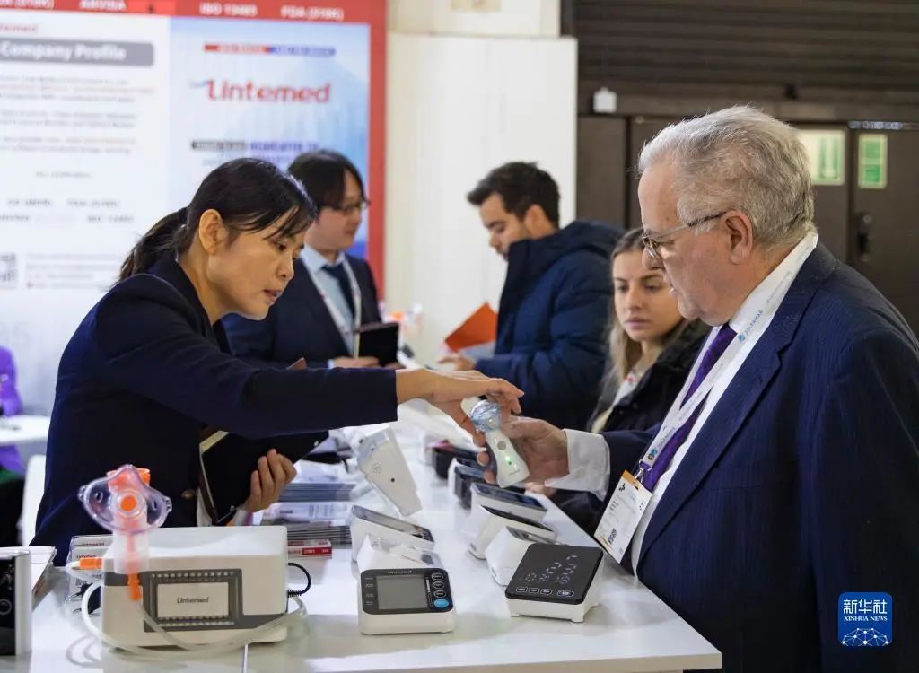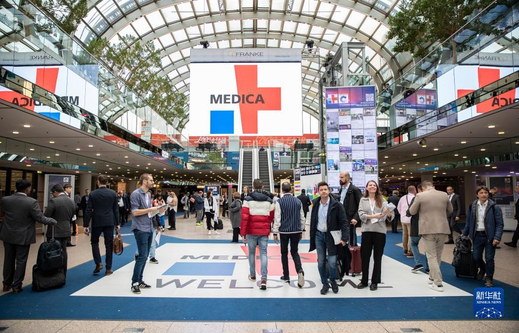 11月13日,在德國杜塞爾多夫國際醫(yī)療器械設備展,參觀者在科曼醫(yī)療展位咨詢洽談。新華社記者 張帆 攝