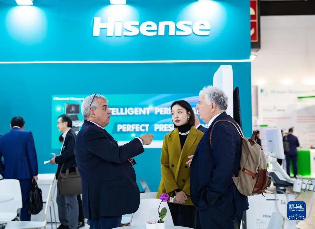 11月13日,在德國杜塞爾多夫國際醫(yī)療器械設備展,參觀者在海信醫(yī)療展位咨詢洽談。新華社記者 張帆 攝