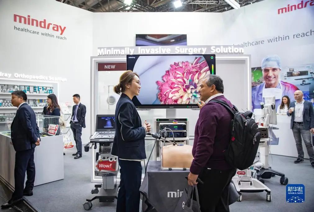 11月13日,在德國杜塞爾多夫國際醫(yī)療器械設備展,參觀者在邁瑞醫(yī)療展位咨詢洽談。新華社記者 張帆 攝