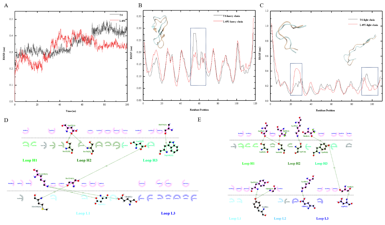 圖2:L49Y動(dòng)力學(xué)模擬分析圖。(A) L49Y模擬過程RMSD圖;(B) L49Y重鏈模擬RMSF圖;(C) L49Y輕鏈模擬RMSF圖;(D) T6-TSLP相互作用分析圖;(E) L49Y-TSLP相互作用分析圖