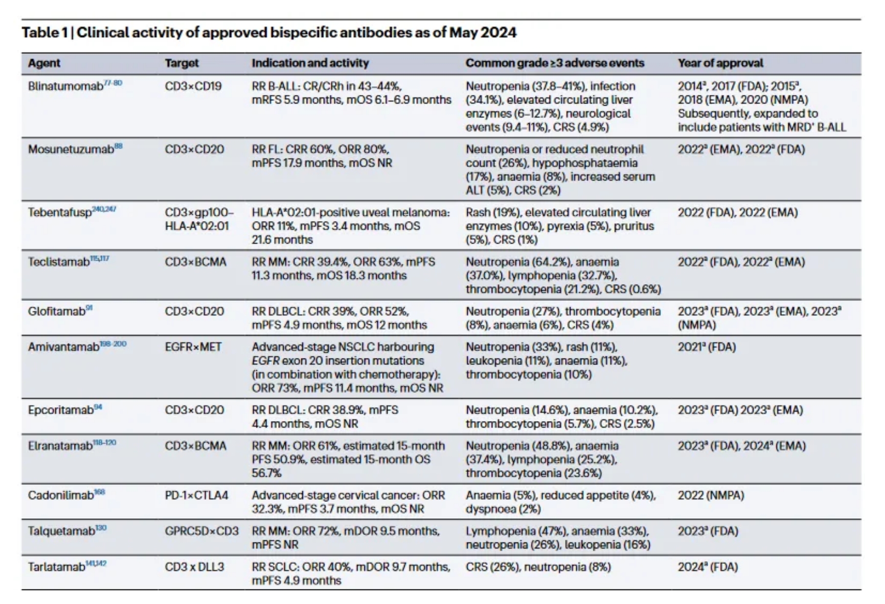 圖2 截至2024年5月批準(zhǔn)的雙特異性抗體的臨床試驗(yàn)情況