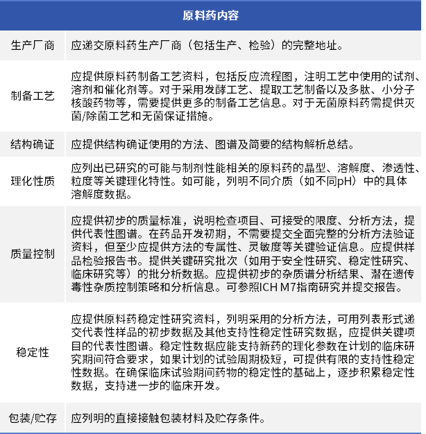 由于小核酸藥物的制備,通常使用固相合成技術(shù),故工藝開發(fā)、工藝放大和質(zhì)量控制上存在一定的壁壘,對(duì)技術(shù)、設(shè)備、環(huán)境有較高的要求,伴隨著的也是高成本,國(guó)內(nèi)對(duì)于這方面的硬件條件配套,還有很大的發(fā)展空間。早期的注冊(cè)申報(bào),如果按照《新藥I期臨床試驗(yàn)申請(qǐng)技術(shù)指南》進(jìn)行工作開展,原料藥和制劑需要按照以下內(nèi)容進(jìn)行。