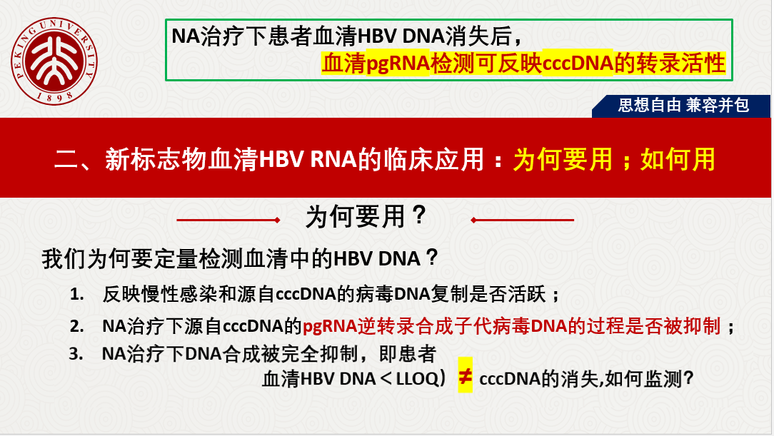 我們?yōu)楹我繖z測(cè)血清中的HBV DNA?反映慢性感染和源自cccDNA的病毒DNA復(fù)制是否活躍;NA治療下源自cccDNA的pgRNA逆轉(zhuǎn)錄合成子代病毒DNA的過(guò)程是否被抑制;NA治療下DNA合成被完全抑制,即患者血清HBV DNA<LLOQ,但不等于cccDNA的消失,如何監(jiān)測(cè)?