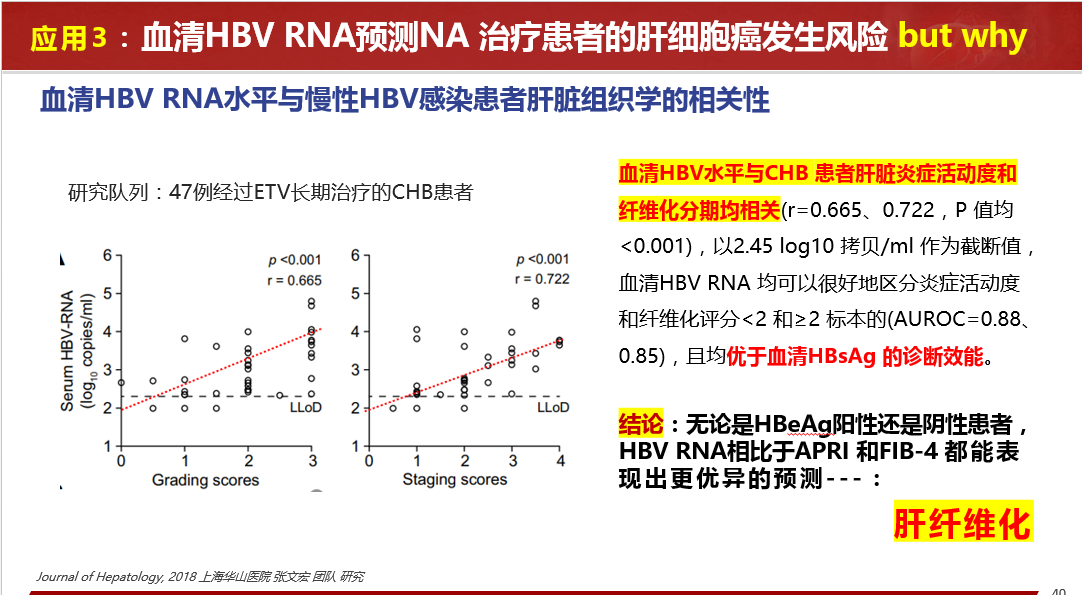 關(guān)于HBV RBA病毒樣顆粒的發(fā)現(xiàn)、血清HBV RNA的產(chǎn)生路徑、存在形式、來(lái)源和特點(diǎn)等做了詳細(xì)闡述,同時(shí)分享國(guó)內(nèi)肝病領(lǐng)域張文宏研究團(tuán)隊(duì)等工作成果,血清HBV RNA水平反映肝內(nèi)cccDNA的轉(zhuǎn)錄活性,血清 HBV pgRNA,是NA治療下HBV DNA < LLOQ后,能夠反映患者肝組織內(nèi)是否有cccDNA活躍轉(zhuǎn)錄的唯一指標(biāo)。