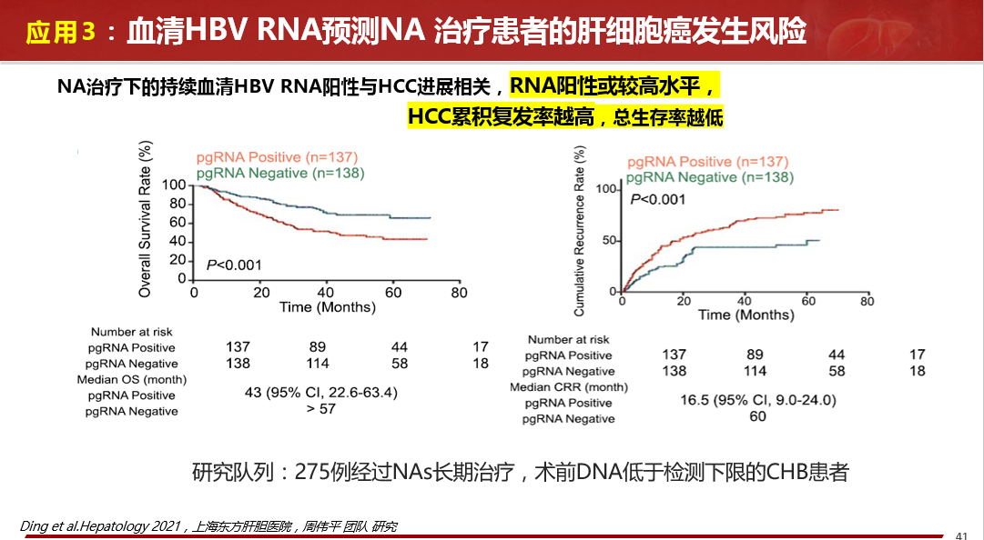 ★ NA治療下的持續(xù)血清HBV RNA陽(yáng)性與HCC進(jìn)展相關(guān),RNA陽(yáng)性或較高水平,HCC累積復(fù)發(fā)率越高,總生存率越低。