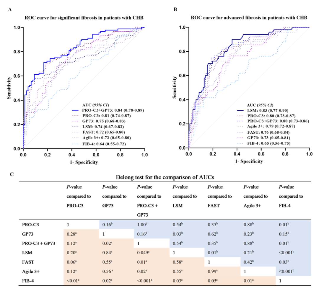 本研究共納入324名初治CHB患者(中位年齡39歲,63.5%為男性),其中167人(51.5%)為顯著纖維化,83人(25.6%)為進展期纖維化,167人接受瞬態(tài)彈性成像檢查。結(jié)果顯示,顯著纖維化和進展期纖維化患者的PRO-C3和GP73水平顯著高于S0-1和S0-2期患者(P<0.001)。多因素Logistic回歸分析顯示,在校正性別、年齡、體重指數(shù)、肝酶和HBV DNA水平后,PRO-C3和GP73均分別是顯著纖維化(PRO-C3:OR 4.67,95%CI: 2.74-7.96;GP73:OR 2.82,95%CI:1.64-4.85)和進展期纖維化(PRO-C3:OR 8.37 95% CI:4.17-16.78;GP73:OR 3.91,95%CI:2.04-7.49)的獨立預(yù)測因子。