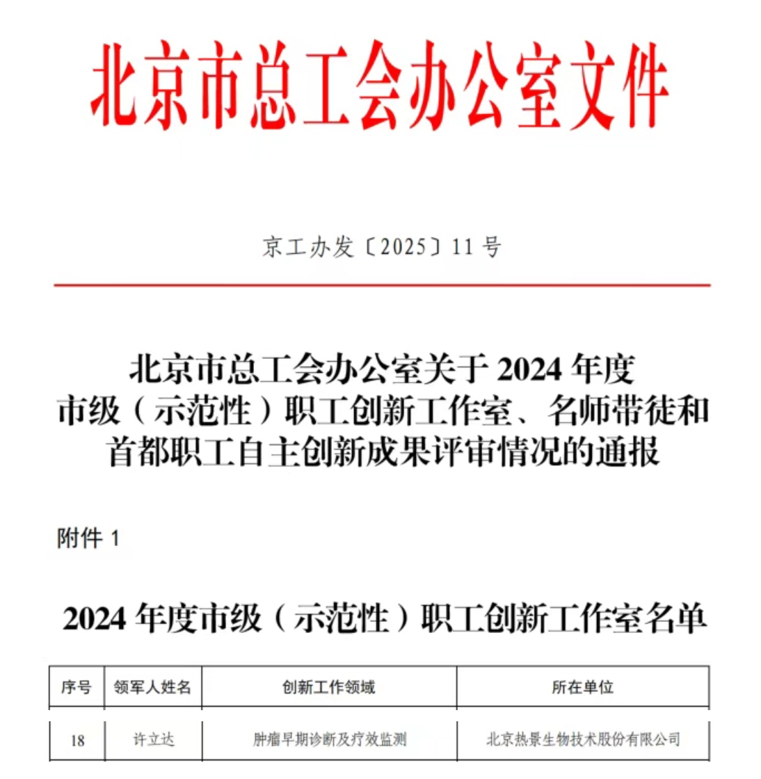 近日,北京市總工會發(fā)布《關(guān)于2024年度市級(示范性)職工創(chuàng)新工作室、名師帶徒和首都職工自主創(chuàng)新成果評審情況的通報》,熱景生物許立達研究員領(lǐng)軍的“腫瘤早期診斷及療效監(jiān)測”創(chuàng)新團隊榮獲“北京市級職工創(chuàng)新工作室”稱號,該稱號是對工作室在腫瘤精準診斷領(lǐng)域持續(xù)創(chuàng)新與技術(shù)轉(zhuǎn)化卓越貢獻的權(quán)威認可。創(chuàng)新驅(qū)動腫瘤診斷革新該工作室專注于腫瘤早期診斷與療效監(jiān)測技術(shù)的研發(fā),依托公司核心原創(chuàng)技術(shù),成功搭建起獨具特色的多組學診斷技術(shù)平臺,實現(xiàn)外泌體、蛋白、核酸等腫瘤標志物從發(fā)現(xiàn)到臨床轉(zhuǎn)化的貫通,助力腫瘤精準診療。
