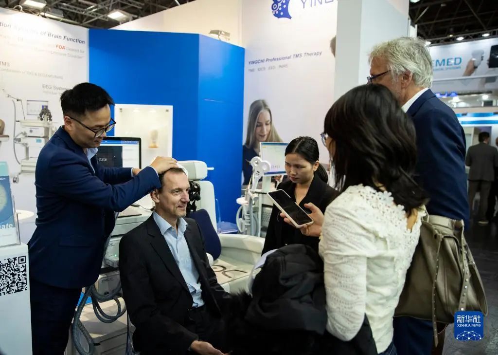 11月13日,在德國杜塞爾多夫國際醫(yī)療器械設備展,參觀者在英智醫(yī)療展位體驗經(jīng)顱磁刺激儀。新華社記者 張帆 攝