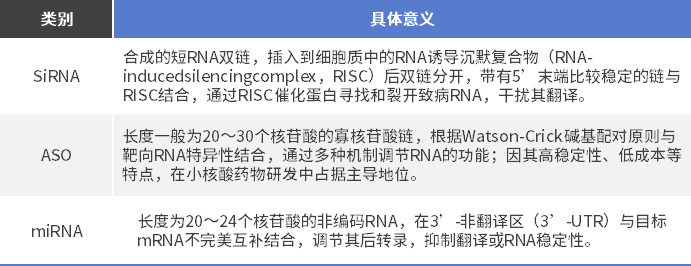 小核酸藥物狹義是指RNA小干擾藥物(small interfering RNAs,siRNA);廣義是除了SiRNA外,還主要包括反義寡核苷酸藥物(antisense oligonucleotides,ASOs)和靶向微小RNA(microRNA,miRNA)等。全球的藥物開發(fā)重點(diǎn)主要為siRNA和ASO。