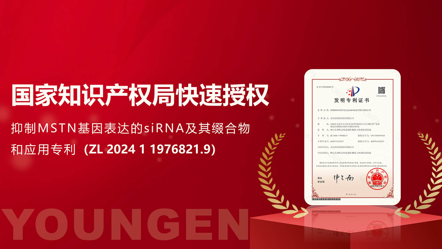 近日,熱景生物參股公司北京堯景基因技術(shù)有限公司,被國家知識產(chǎn)權(quán)局快速授權(quán)了名為“抑制MSTN基因表達的siRNA及其綴合物和應(yīng)用”專利(ZL202411976821.9)。該專利提供一種能夠抑制MST...